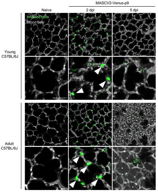 To generate SARS-CoV-2, which causes severe pneumonia in C57BL/6J mice and expresses a fluorescent reporter protein in infected cells, the fluorescent reporter gene Venus and a porcine tescherovirus (PTV-1) 2A proteolytic cleavage site was inserted upstream of the N gene of MASCV2-p25, as described previously [33], using reverse genetics (named MASCV2-Venus) (Supplementary Figure S2) (Table 1). MASCV2-Venus exhibited reduced virulence in C57BL/6J mice compared with MASCV2-p25; therefore, to promote additional adaptation to the C57BL/6J mouse strain, we conducted serial lung-to-lung passages in C57BL/6J mice and generated a mouse-adapted reporter SARS-CoV-2 (named MASCV2-Venus-p9) (Figure 5A) (Table 1). The sequencing analysis revealed that the MASCV2-Venus-p9 strain possesses a V233I substitution in NSP4 and an L83F substitution in NSP13 (Table 2). In addition, MASCV2-Venus-p9 possessed the a28262g mutation in the non-coding region between ORF8 and the Venus gene. Although this mutation does not cause an amino acid substitution, this site serves as a translation regulatory sequence (TRS) that is important for gene transcription [37]. Within the TRS, there is a highly conserved core sequence (ACGAAC for SARS-CoV-2; nucleotide positions 28260–65 in TY7-501). When we inserted the Venus gene, as described by others [33], the TRS core sequence before the N gene in the MASCV2-Venus was ACAAAC, which is not the authentic TRS core sequence. However, during the passage of MASCV2-Venus in mice, the a-to-g transition occurred, resulting in the formation of the authentic TRS core sequence. In 24-week-old C57BL/6J mice, MASCV2-Venus-p9 caused significant weight loss without causing mortality. In contrast, young B6 mice infected with MASCV2-Venus-p9 showed no weight loss (Figure 5B). The infection of C57BL/6 mice with MASCV2-Venus-p9 resulted in high virus titers in the lungs in both the younger and older (24-week-old) age groups at Day 2 post-infection (Figure 5C). The viral load of MASCV2-Venus-p9 at Day 2 of infection was comparable to that of MASCV2-p25 in both young and adult mice (Figure 3C and Figure 5C). In contrast, the viral load of MASCV2-Venus-p9 at Day 5 of infection tended to be lower than that of MASCV2-p25 in both the young and adult groups. To observe the pathological changes in SARS-CoV-2-infected lungs in living animals, we examined MASCV2-Venus-p9-infected C57BL/6J mice using an in vivo imaging system that we established previously [11,34]. Two days after infection, large numbers of infected cells expressing Venus were found in the lungs of both young and adult B6 mice. At 5 days post-infection, a granular Venus signal was observed, indicating that the infected cells had disintegrated (Figure 6). In contrast, fluorescence-labelled dextran leaked from the blood vessels into the alveoli in the lungs of adult C57BL/6J mice infected with MASCV2-Venus-p9 on Day 5 of infection, indicating that increased vascular permeability associated with tissue damage had occurred.