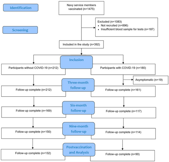 This study involved navy personnel who received two doses of the Pfizer-BioTech BNT162b2 vaccine. Follow-up was completed for one year, with four blood samples, which were considered as visits: visit 1 (3 months), visit 2 (6 months), visit 3 (9 months) with the BTN vaccine, and visit 4 (1 year, 3rd booster) with the ChAd vaccine.