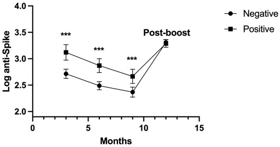 The repeated measures analysis of log anti-N and anti-S levels showed a statistical difference between participants who reported a history of COVID-19 and those who did not. For log anti-N, the results are expressed as a mean (standard deviation), at three months: −0.350 (0.749) versus −1.195 (0.594), p-value < 0.001; at six months: −0.526 (0.714) versus −1.214 (0.532), p-value < 0.001; and at nine months: −0.668 (0.702) versus −1.129 (0.552), p-value < 0.001. At the 3- to 9-month assessments, the anti-N value was higher in participants with COVID-19. Alternatively, in subjects with a positive history of COVID-19, the post-vaccination baseline anti-S value was higher than in the negative history of COVID-19; the values in both groups decreased over the 9 months. The value of anti-S antibodies in positive and negative subjects increased post-booster (Figure 2).