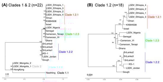 Core genome phylogenies for (A) all 22 LSDV samples and (B) clade 1.2 only (18 samples). (A) The clade 1.1 Neethling strain was distinct from the clade 2 Hong Kong/Mongolia isolates. (B) Clade 1.2 was divided into three groups: clade 1.2.2 related to Kenyan sheep and goat pox (KSGP) vaccines (blue, n = 6), clade 1.2.3 linked to west and central Africa (green, n = 5) and clade 1.2.1 with samples from the Middle East and east Africa (red, n = 7). Bootstraps with values > 90 are shown.