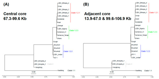 Phylogenies of the (A) central (67,250 to 99,575 bp) and (B) adjacent core genome regions (13,851–66,966 and 99,608–106,910 bp, concatenated). (A) At the central core genome, clade 2’s Hong Kong and the Mongolia pair (grey) had ancestry more like clade 1.2.2 (clade 1.2.2 in blue, clade 1.2.3 in green, clade 1.2.1 in red). (B) At the adjacent core genome regions, clade 2 was more like Neethling (clade 1.1).