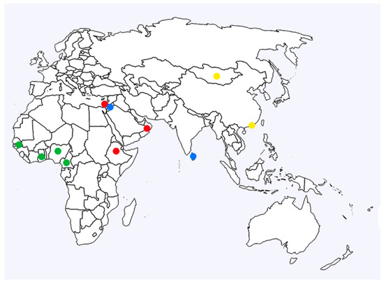 Geographic distribution of the LSDV strains. Colour designations: clade 1.2.1 red, clade 1.2.2 blue, clade 1.2.3 green, and clade 2 yellow.