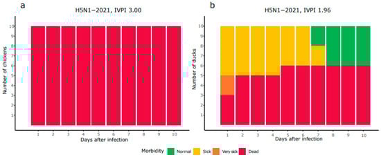 Morbidity and mortality of chickens (a) and Pekin ducks (b) inoculated intravenously with H5N1-2021.