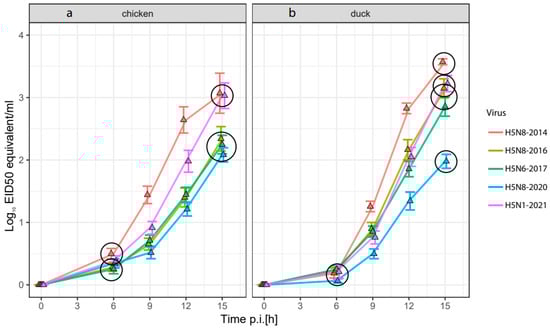 Increase in virus titer from the inoculation dose (0 h time point) of five HPAI viruses in the allantoic fluid of embryonated eggs of (a) chickens and (b) Pekin ducks over time. Measured by RT-PCR and adjusted to mean log10 EID50/mL (depicted by the triangles). Standard error depicted by error bars. Circles indicate significant differences in the replication rate from 0 to 6 h and from 6 to 15 h post infection (p < 0.05). In the chicken model, two clusters are observed during both time frames: Cluster 1 (H5N8-2014 and H5N1-2021), followed by Cluster 2 (H5N8-2016, H5N6-2017 and H5N8-2020). In the duck model, multiple overlapping clusters are observed during the 6 to 15 h time frame: Cluster 1 (H5N8-2014), Cluster 2 (H5N1-2021 and H5N8-2016), Cluster 3 (H5N8-2016 and H5N6-2017), and lastly Cluster 4 (H5N8-2020). In the 0 to 6 h time frame, only one cluster including all viruses was observed in the duck in ovo model.