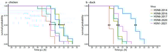 Survival probabilities of embryonated chicken (a) and duck (b) eggs infected with five different HPAI viruses (n = 5 per group). Significant differences are marked by the brackets (p < 0.05).