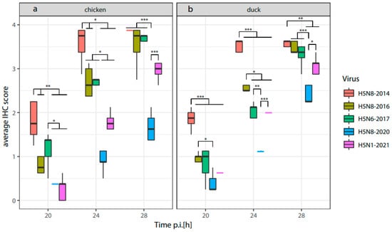 Average virus antigen score (immunohistochemistry) over time in tissues of embryonated chicken (a) and duck (b) eggs infected with five HPAI H5-viruses. If a boxplot could not be generated the mean is indicated by a colored line. Investigated tissues: Cerebrum, conchae submucosa, conchae epithelium, lung, heart, liver, intestine and chorion allantoic membrane. N = 5 per species and virus,* p < 0.05, ** p < 0.01 and *** p < 0.001.