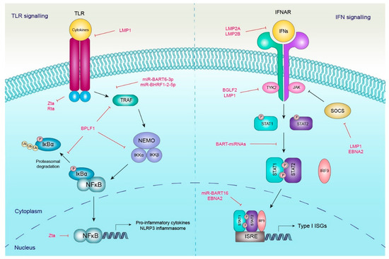 An overview of Epstein–Barr virus (EBV) regulatory strategies for Toll-like receptor (TLR) and interferon (IFN) signalling cascades during the evasion of innate immune responses. Immune response signalling through TLR (left part of the diagram) and IFN (right part) cascades is mainly negatively regulated by both EBV proteins and miRNAs (indicated in red fonts). EBV employs a few tactics for innate immune evasion: (1) downregulation of the expression and activity of TLRs and IFNARs, (2) modulation of type I IFN -STAT pathway and interferon-stimulated gene (ISG) expression, (3) inhibition of NF-κB signal transduction, and (4) repression of the expression of pro-inflammatory cytokines and inflammasomes. See text for further details.