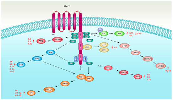 NF-κB signalling activated by LMP1 was shown to induce the production of various immunomodulatory molecules. One of the first studies by Eliopolous et al. (1997) demonstrated the induction of IL-6 production via NF-κB pathway activation in SV40-transformed keratinocytes and human carcinoma cell lines [100]. IL-6, a pleiotropic cytokine, was shown to have a crucial role in inflammation, with recent data suggesting it is also one of the most important cytokines during viral infection, due to several potential mechanisms which can induce viral persistence, immune evasion and ultimately lead to chronic infection [115]. Furthermore, Ren et al. (2004) showed in epithelial/NPC hybrid cell line NPC-KT that LMP1 induces IL-8 by activation of NF-κB via the NF-κB binding site in the IL-8 promoter [116], while Vockerodt et al. (2005) demonstrated that the LMP1-mediated expression of IP-10 in lymphoma cells is independent of inducers such as IFN-γ, IL-18 and TNF-α and its promoter activity can be regulated by NF-κB signalling along with the p38 pathway [117]. Therefore, the ability of LMP1 to act as a strong chemokine inducer further increases the inflammatory environment by the upregulation of infiltrating immune cells and exacerbating oncogenic processes [118]. LMP1-induced NF-κB signalling was shown to play a key role in IL-8 production in a human gingival epithelial cell line [119]. IL-1 induction by LMP1 was observed by Huang et al. (2010), who detected the upregulation of IL-1α and IL-1β secretion in epithelial cells [120]. LMP1-mediated induction of the NF-κB pathway may result in the activation of IL-1α and IL-1β promotors, and the ample production of IL-1α and IL-1β may facilitate lymphocyte infiltration of an NPC tumour [120]. Interestingly, it was observed that LMP1-mediated NF-κB activation has many similarities with IL-1β induced NF-κB signalling, with 118 out of the 155 LMP1 NF-κB activation pathway components being similarly important for IL-1β-induced NF-κB signalling in HEK293 cells [121]. A recent report showed that IL-1β may serve as the inducer of angiopathy in systemic chronic active Epstein–Barr virus infection [122]. Furthermore, LMP1-mediated NF-κB activation was shown to induce survival signals not only in B cell lines but also in T and NK cells, suggesting its potential role in the development of EBV-positive T or NK cell neoplasms [123].