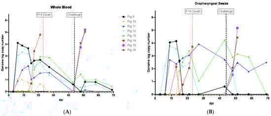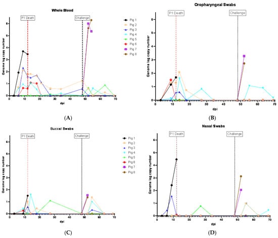 All procedures, except oral fluid collection and measuring rectal temperatures, were performed under general anesthesia through the inhalation of isoflurane 2% delivered in 100% oxygen. Rectal temperatures were taken from individual pigs in the morning after oral fluid collection, under physical restraint or while the pigs were eating. Any pig reaching the humane endpoint was euthanized using a 10 mL sodium pentobarbital (240 mg/mL) intravenous injection. Any animal found dead or euthanized were subjected to a full post-mortem examination and tissue collection for virus detection and histopathology.