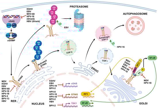 Finally, direct binding-mediated antagonism of STING has also been reported in oncogenic papillomaviruses. A study showed that the oncoprotein E7 of high-risk HPV18 antagonizes the cGAS-STING pathway by direct binding of STING and further highlighted that the LXCXE motif of E7 is important for this blockade [192]. It was also shown that HPV18 E7 binds to STING in a unique region critical for NF-κB activation and blocks the nuclear accumulation of p65, thereby selectively inhibiting NF-κB signaling but not IRF3 signaling [181]. This finding differs from the IFN downregulating effect that KSHV and MDV proteins exhibit.