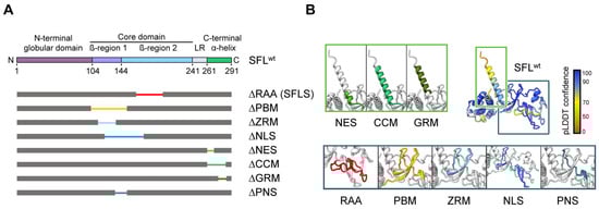 SFL structure prediction and SFL mutants analyzed. (A) A schematic illustration of SFL domains and regions predicted by AlphaFold2. The N-terminal globular domain (aa 1–103), the core domain (aa 104–240, including the β-region 1 (aa 104–143) and 2 (aa 144–240)), the linker region (LR; aa 241–260) and the C-terminal α-helix (aa 261–291) are indicated in SFL WT. Deleted regions are represented by narrowed colored lines: RAA, required for antiviral activity (aa 164–199; red); PBM, poly(A)-binding protein cytoplasmic 1-binding motif (aa 102–150; yellow); ZRM, zinc ribbon motif (aa 112–135; light blue); NLS, nuclear localization signal (aa 121–173; blue); NES, nuclear export signal (aa 261–269; light green); CCM, coiled-coil motif (aa 261–285; green); GRM, glutamic acid-rich motif (aa 276–286; dark green) and the overlapping region of PBM and NLS termed PNS (aa 135–150; teal blue). Delta indicates the lack of the denoted region. (B) SFL structure prediction by AlphaFold2. pLDDT score indicates the confidence of the structure prediction for SFL WT. Regions deleted in SFL mutants are color-coded and shown in separate boxes.
