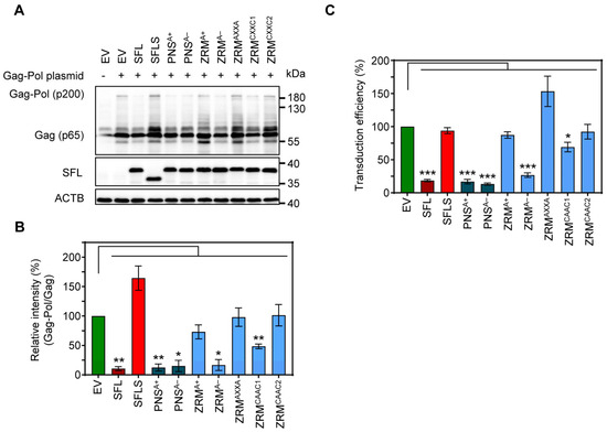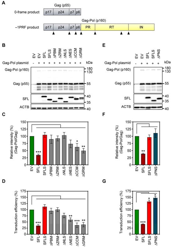 3.1. Deletion of the ZRM and PNS Regions of SFL Suppresses Gag-Pol Expression and Antiviral Activity