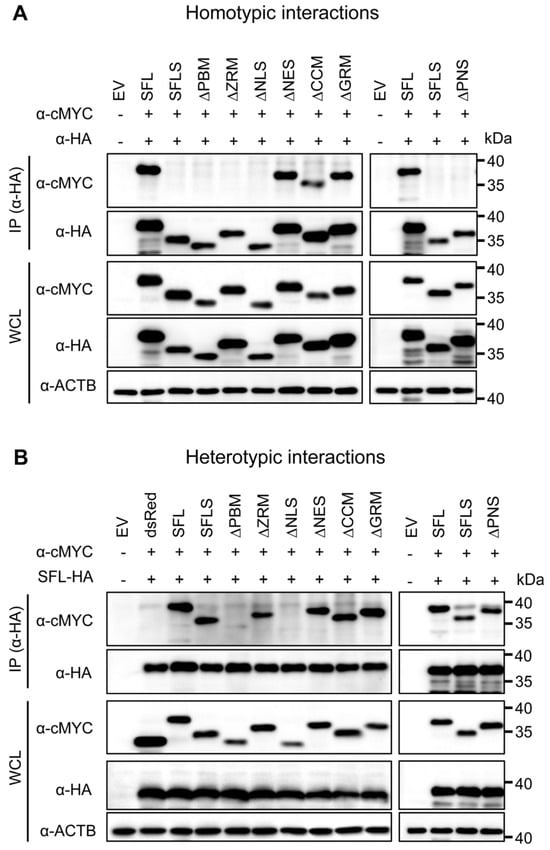 Based on the observation that SFL still interacts with SFLS [15], we also tested for heterotypic interactions. SFL interacted with SFLS and SFL mutants with the exception of mutants ΔPBM and ΔNLS, which supports the notion that these mutants might be misfolded (Figure 3B). Finally, we analyzed homo- and heterotypic interactions of the ΔPNS mutant, which lacked a part of the core domain and did not have antiviral activity, although it was efficiently expressed. The ΔPNS mutant was not able to self-interact but still interacted with SFL and SFLS (Figure 3A,B). Collectively, our results indicate that the structural integrity of the core domain is important for homotypic interactions, while the C-terminal α-helix is likely not involved.