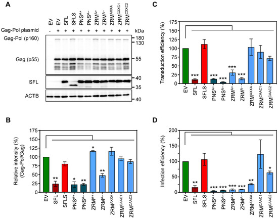 The impact of alanine mutations in ZRM and PNS on SFL antiviral activity against HIV-1. (A) The inhibition of Gag-Pol expression. The experiments were carried out and analyzed as described in the legend of Figure 2B,E. A representative blot out of three independent experiments is shown. (B) Quantification of SFL-mediated inhibition of Gag-Pol expression. The band intensities from panel A were quantified and the intensity of the Gag-Pol band was normalized to that of the Gag band. Relative band intensity measured for EV transfected control cells was set as 100%. Error bars indicate standard error of the mean (SEM). Only statistically significant values are indicated. * p < 0.05; ** p < 0.01; *** p < 0.001. (C) Transduction efficiency of single-cycle HIV-1 reporter particles produced in the presence of SFL alanine mutants. The experiments were carried out as described in the legend of Figure 2D. Transduction measured for the control particles produced in the presence of an EV was set as 100%. The average of seven biological replicates carried out with technical quadruplicates is shown; error bars indicate SEM. Only statistically significant values are indicated. * p < 0.05; ** p < 0.01; *** p < 0.001. (D) Infection efficiency of authentic HIV-1 particles produced in the presence of SFL alanine mutants. 293T cells were co-transfected with plasmids encoding SFL, SFLS, or SFL mutants and a plasmid encoding the complete HIV-1 NL4-3 genome. Co-transfection of an EV served as the control. At 72 h post-transduction, supernatants were collected and used for the infection of HIV reporter cells (TZM-bl). At 48 h post-infection, TZM-bl cells were lysed and the luciferase activity in cell lysates was determined. Luciferase activity measured upon infection with HIV-1 produced in the presence of an EV was set as 100%. The average of three biological replicates carried out with technical triplicates is shown; error bars indicate SEM. Only statistically significant values are indicated. * p < 0.05; ** p < 0.01; *** p < 0.001.