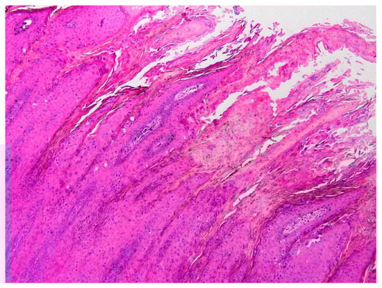 Histology of the papilloma revealed an approximately 1 cm diameter exophytic mass that consisted of markedly thickened folded epithelium. The epithelium was covered by increased ortho- and parakeratotic keratin, and spikes of keratin resulted in a filiform appearance to the surface of the papilloma (Figure 2). Epithelial cells close to the base of the lesions appeared mildly crowded, but no evidence of neoplastic transformation or invasion of underlying submucosa was visible. Numerous keratinocytes with cytoplasm expanded by smudged blue–grey material were visible within the thickened epithelium and keratinocytes contained prominent keratohyalin granules (Figure 3).