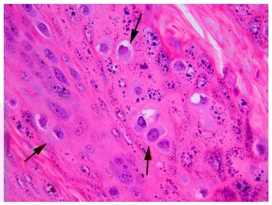 Compared to other species, neoplasia due to PV infection appears to be rare in dogs. However, multiple oral SCCs were reported in a dog in association with canine papillomavirus (CPV) type 17 []. In addition, an oral papilloma caused by CPV1 was reported to progress to SCC in a dog with persistent oral papillomas []. Furthermore, a small proportion of viral plaques may progress to SCC, especially those caused by CPV16 [].