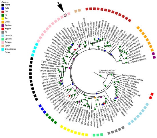 Unrooted maximum likelihood phylogeny based on concatenated nucleotide alignment of CPV26 L1 ORF sequence (arrow) with 97 other papillomavirus (PV) types of different species and genera. Accession numbers for sequences used are included. Abbreviations used include Alces alces papillomavirus, AaPV; Arctocephalus gazella papillomavirus, AgaPV; Alouatta guariba papillomavirus, AguPV; Ailuropoda melanoleuca papillomavirus, AmPV; Bovine papillomavirus, BPV; Capreolus capreolus papillomavirus, CcaPV; Caretta caretta papillomavirus, CcPV; Colobus guereza papillomavirus, CgPV; Capra hircus papillomavirus, ChPV; Chelonia mydas papillomavirus, CmPV; Canine papillomavirus, CPV; Equus caballus -+papillomavirus, EcPV; Erethizon dorsatum papillomavirus, EdPV; Erinaceus europaeus papillomavirus, EePV; Felis catus papillomavirus, FcaPV; Fringilla coelebs papillomavirus, FcPV; Francolinus leucoscepus papillomavirus, FlPV; Hydrurga leptonyx papillomavirus, HlPV; Lynx rufus papillomavirus, LrPV. Leptonychotes weddellii papillomavirus LwPV; Mesocricetus auratus papillomavirus, MaPV; Mastomys coucha papillomavirus, McPV; Macaca fascicularis papillomavirus, MfPV; Micromys minutus papillomavirus, MmiPV; Macaca mulata papillomavirus, MmPV; Multimammate rat papillomavirus, MnPV; Ovis aries papillomavirus, OaPV; Oryctolagus cuniculus papillomavirus, OcPV; Odocoileus virginianus papillomavirus, OvPV; Puma concolor papillomavirus, PcPV; Psittacus erithacus timneh papillomavirus, PePV; Procyon lotor papillomavirus, PlPV; Panthera leo persica papillomavirus, PlpPV; Phocoena phocoena papillomavirus, PphPV; Pan paniscus papillomavirus, PpPV, Phocoena spinipinnis papillomavirus, PsPV; Rousettus aegyptiacus papillomavirus, RaPV; Rattus norvegicus papillomavirus, RnPV; Rangifer tarandus papillomavirus, RtPV; Sylvilagus floridanus papillomavirus, SfPV; Saimiri sciureus papillomavirus, SscPV; Sus scrofa papillomavirus. SsPV; Tursiops truncatus papillomavirus, TtPV; Trichechus manatus latirostris papillomavirus, TmPV; Ursus maritimus papillomavirus, UmPV; and Uncia uncia papillomavirus, UuPV. Internal branches are colored based on inferred bootstrap support values, as determined using an approximate likelihood ratio test (aLRT) with the Shimodaira–Hasegawa-like procedure. Scale bar indicates genetic distance (nucleotide substitutions per site).