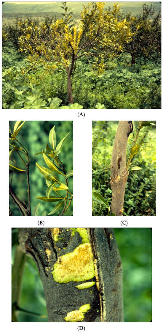 A mandarin tree from Greece with cachexia (xyloporosis) symptoms. (A) The whole tree, (B) Shoots and leaves with perineural chlorosis, (C) Outside the tree trunk, (D) Detail of inside the tree trunk after removing the phloem.