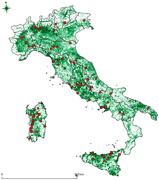EqHV PCR-positive samples detected in this study are shown on the map. Red dots represent equestrian (EQU) positive samples, red diamonds competition (COM) positive samples, red triangles work/meat (W/M) positive samples, and red squares reproduction (REP) positive samples. Only regional borders are reported. The green shading represents the numeric density of the Italian equine premises.