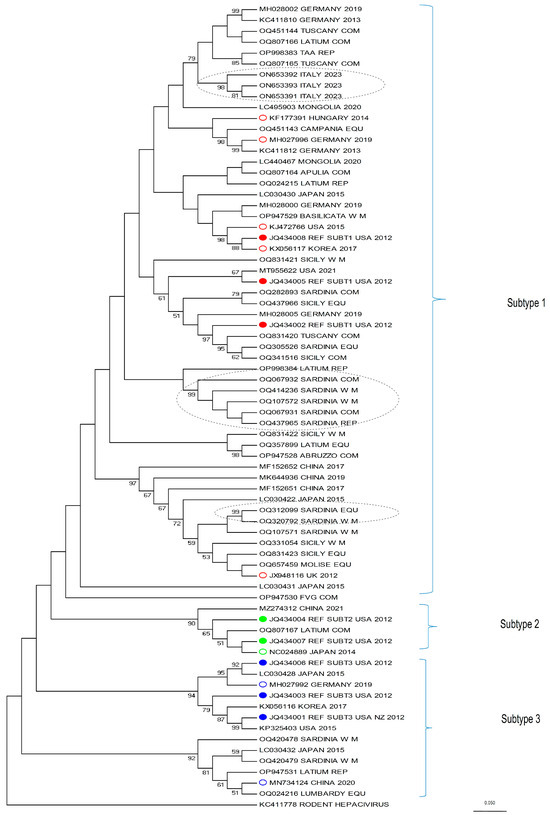 A Veriti™ 96-Well Fast Thermal Cycler (Applied Biosystems®, Fisher Scientific Italia, Milan, Italy) was used to perform the PCR and the SuperScript™ III One-Step RT-PCR System with Platinum™ Taq DNA Polymerase kit (Invitrogen, Applied Biosystems®, Fisher Scientific Italia, Milan, Italy) was employed with a primer concentration of 30 pmol/µL (0.28 µM, 0.33 µL). PCR products were visualized and verified for their length in bp in 1.5% agarose gel capillary electrophoresis using QIAxcel Advanced (Qiagen, Milan, Italy) and following manufacturer’s instructions. The samples were then recovered and purified with ExoSap kit (Applied Biosystems®, Fisher Scientific Italia, Milan, Italy) according to manufacturer’s instructions, and visualized again on capillary electrophoresis to ensure correct purification and the integrity of the amplicons. Sequencing was performed using Sanger Sequencing 3500 Series Genetic Analyzers (Applied Biosystems®, Fisher Scientific Italia, Milan, Italy) following manufacturer’s instructions. Each pair of chromatogram trace files was assembled in consensus sequence with the Tracy command line pipeline (version 0.7.3, https://bmcgenomics.biomedcentral.com/articles/10.1186/s12864-020-6635-8, accessed on 5 June 2023), which uses a progressive multiple sequence alignment algorithm (https://academic.oup.com/bioinformatics/article/25/9/1118/204548 accessed on 5 June 2023) obtaining a graph-based alignment built on pairwise overlap alignments. Sequences were edited by BioEdit Software (version 7.2.5, Tom Hall, Raleigh, NC, USA) and aligned by ClustalW Multiple Alignment internal tool. The evolutionary tree for the NS3 fragment of EqHV was inferred by using the Maximum Likelihood method, based on the Tamura–Nei model and using MEGA11 software [50]. Initial tree(s) for the heuristic search were obtained by applying the Neighbor Joining method to a matrix of pairwise distances, estimated using the Maximum Composite Likelihood (MCL) approach). In addition, the results obtained were confirmed by applying the Maximum Likelihood model produced by IQ-TREE 2 software [51], based on the TPM2+I+G4 evolutionary model chosen for the trees by ModelFinder [52]. Phylogenetic tree topology consistency was checked using the Bootstrap method, producing 1000 replicates [50]. In addition to the sequence of isolates from the present study, sequences of the EqHV NS3 gene were downloaded from Genbank. Some were taken as reference sequences (sub-type 1: JQ434002, JQ434005, JQ434008; sub-type 2, JQ434004, JQ434007; and sub-type 3: JQ434001, JQ434003, JQ434006) [3]; others and more recent sequences were used to corroborate the discrimination of these three sub-types (MK644936 [41] subt1, MT955622 [8] subt1, MZ274312 [44] subt2, MN734124 [37] subt3). Several sequences were employed to enrich the analysis with European data (MH027992, MH027996, MH028000, MH028002, MH028005 [47], KF177391 [28], JX948116 [29], KC411810, KC411812 [46]). Other Asian and American sequences were utilized to enrich the analysis with global data (LC495903, LC440467 [26], LC030422, LC030428, LC030430, LC030431, LC030432 [31], KX056116, KX056117 [32], MF152651, MF152652 (Direct Submission), NC024889 [42], KJ472766 [5], KP325403 [6]). Furthermore, some other recent Italian sequences were kindly provided by [22] (ON653391, ON653392, ON653393) and added to the analysis. Sequence KC411778 of Rodent Hepacivirus was used as outgroup [46].