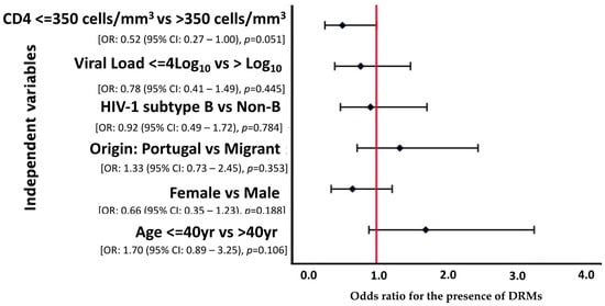 A multivariate analysis was carried out considering variables where p < 0.2, however, none of the variables was statistically related to presentation with DRMs (p > 0.05). Nonetheless, we observed that patients with a CD4 cell count above 350 cells/mm3 were less likely [OR = 0.52 (95% CI: 0.27–1.00), p = 0.051] to develop DRMs, with borderline statistical significance (Figure 1).