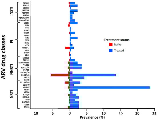 Distribution of the observed DRMs according to the ARV drug class and treatment status. Abbreviations: NRTIs, nucleoside reverse transcriptase inhibitors; NNRTIs, non-nucleoside reverse transcriptase inhibitors; PIs, protease inhibitors; INSTIs, integrase strand inhibitors. Evaluation of drug resistance mutations affecting susceptibility to NRTIs, NNRTIs, PIs, and INSTIs, based on the WHO SDRM list updated in 2009.