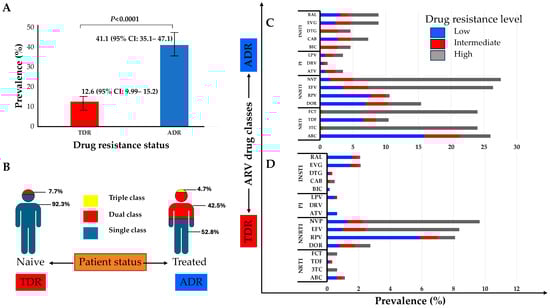 (A) Prevalence of transmitted drug resistance (TDR) and of acquired drug resistance (ADR); (B) proportion of TDR and ADR for single to multiple class resistance to ARV; (C) clinical impact of the DRMs on ART-experienced patients; (D) clinical impact of the DRMs on ART-naïve patients. Scores of low-level (scores 2 and 3, blue), intermediate-level (score 4, red), or high-level (score 5, grey) resistance were used to predict phenotypic resistance. Phenotypic characterization was carried out on the HIV drug resistance database website at Stanford University (https://hivdb.stanford.edu/, accessed on 15 December 2023). Abbreviations: ADR, acquired drug resistance; TDR, transmitted drug resistance; NRTIs, nucleoside/tide reverse transcriptase inhibitors; NNRTIs, non-nucleoside reverse transcriptase inhibitors; PIs, protease inhibitors; INSTIs, integrase strand inhibitors; RAL, raltegravir; EVG, elvitegravir; DTG, dolutegravir; CAB, cabotegravir; BIC, bictegravir; LVP, lopinavir; DRV, darunavir; ATV, atazanavir; NVP, nevirapine; EFV, efavirenz; DOR, doravirine; FTC, emtricitabine; TDF, tenofovir; 3TC, lamivudine; ABC, abacavir.