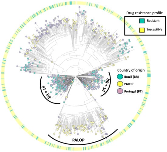 3.4. Country of Origin and DRM Distribution by Phylogenetic Tree