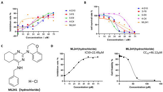 Screening of anti-RV small-molecule compounds. (A) ELISA was used to detect the inhibitory rate of five compounds against rotavirus. (B) CCK8 was used to measure the toxic effects of the five compounds on the cells. (C) The structural formula of ML241 (hydrochloride). (D) Half of the inhibitory rate of ML241 against rotavirus and half of its toxic effect on MA104 cells.
