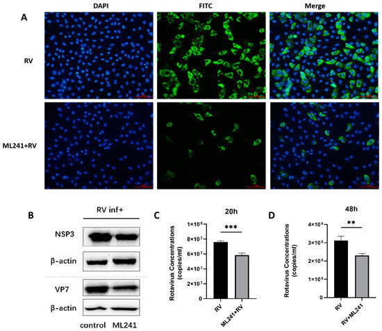 To analyze the effect of the small-molecule compound ML241 on RV, immunofluorescence, R-qPCR, and WB were used to detect viral protein expression and viral replication 20 h after the addition of the drug and virus. The results showed that, compared with the control group, the addition of ML241 inhibited the expression of viral proteins and viral replication (Figure 2A–C).