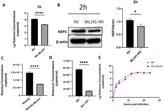 To analyze whether ML241 affected the process by which RV entered a cell, the virus copy number and NSP3 protein expression 2 h after viral infection were detected using RT-qPCR and WB. The results showed that after adding ML241 for 2 h, the virus copy number decreased (Figure 3A), and the expression of the NSP3 protein decreased (Figure 3B). To analyze whether ML241 affected the process of RV entry into its host cells, the viruses were treated with ultraviolet irradiation at 220 nm (UV dose 22.5 mJ/cm2) to disrupt their nucleic acids and prevent them from RNA replication and protein translation. Compared with the RV group without UV irradiation, the NSP3 copy number was significantly reduced after UV irradiation (Figure 3C). After adding ML241 to the UV-irradiated RV group, NSP3 also decreased compared with the UV-irradiated RV group. This decrease (Figure 3D) suggests that ML241 affected the process of RV entry into its host cells. RT-qPCR was used to detect the NSP3 copy number at different time points, and it was found that ML241 had a significant inhibitory effect at the early stage of RV infection (Figure 3E), and its inhibition of rotavirus proliferation was still statistically significant until 48 h (Figure 2D).