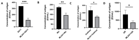To verify the inhibitory effect of ML241 on other rotavirus strains, we measured the amount of antigen in different rotavirus strains after the administration of ML241 by ELISA. The results showed that ML241 had inhibitory effects on the RV of SA11, UK, Wa, and Gottfried strains (Figure 4).
