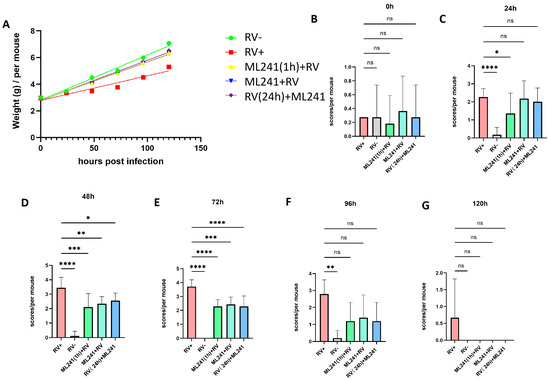 In vivo effects of ML241 on rotavirus. (A) Body weights of the suckling mice in each group. (B) Diarrhea scores of suckling mice in each group before challenge. (C) Diarrhea scores of suckling mice in each group 24 h after challenge. (D) Diarrhea scores of suckling mice in each group 48 h after challenge. (E) Diarrhea scores of suckling mice in each group 72 h after challenge. (F) Diarrhea scores of suckling mice in each group 96 h after challenge. (G) Diarrhea scores of suckling mice in each group 120 h after challenge. Data are presented as mean ± SD. Significant differences were determined by an unpaired t test (ns p > 0.05, * p < 0.05, ** p < 0.01, *** p < 0.001, **** p < 0.001).