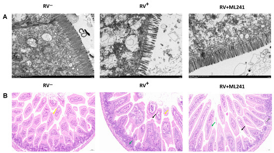 In vivo effects of ML241 on rotavirus. (A) Electron microscopic observation of small intestinal lesions in the different treatment groups. (B) HE staining was used to observe small intestinal lesions in the different treatment groups.