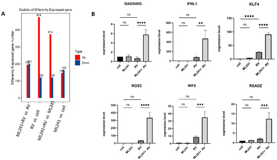 ML241 antagonizes ERK 1/2 activation of the MAPK signaling pathway via RV and inhibits rotavirus replication. (A) Number of differentially expressed genes in each group. (B) Relative expression of the differentially expressed genes in each group. (ns p > 0.05, ** p < 0.01, *** p < 0.001, **** p < 0.001).