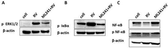 ML241 antagonizes ERK 1/2 activation of the MAPK signaling pathway via RV and inhibits rotavirus replication. (A) Western blotting was used to detect the expression of phosphorylated ERK1/2. (B) Western blotting was used to detect the expression of phosphorylated IκBα. (C) Western blotting was used to detect the expression of NF-κB and phosphorylated NF-κB.