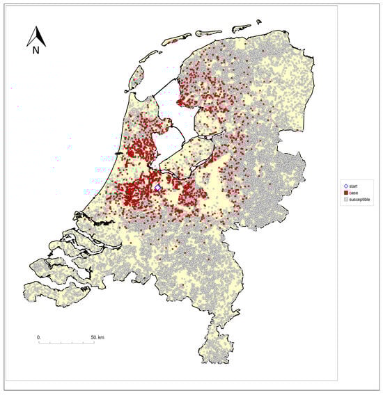 Wind direction data from the Royal Netherlands Meteorologic Institute indicate that, in the study period, for less than 10% of the observation days, wind was blowing in the southern direction, while on the basis of a homogeneous distribution, this would be expected to be around 25%. However, in line with the previous analyses [,], we did not attempt to include any dependence on wind direction in our analysis. As a result, we did not investigate to which extent wind direction could explain the fact that the epidemic moved spatially in the eastern, western, and northern directions, but hardly in the southern direction (Figure 1).