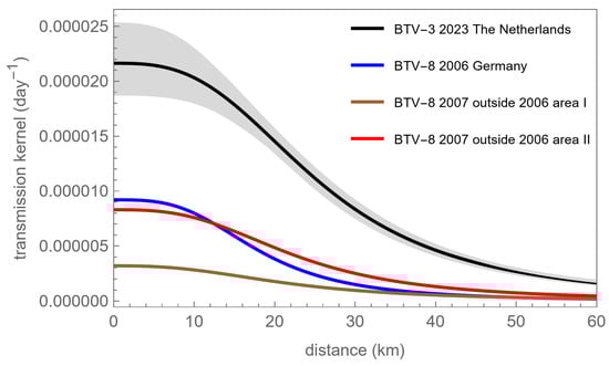 In Table 1, we list the point estimates of the kernel parameters and their confidence bounds. As a reference, we also include estimates obtained by De Koeijer et al. [] and by Boender et al. [] for three different periods and/or areas in the BTV-8 epidemic of 2006–2007. In Figure 2, the kernels corresponding to the estimates in Table 1 are plotted.