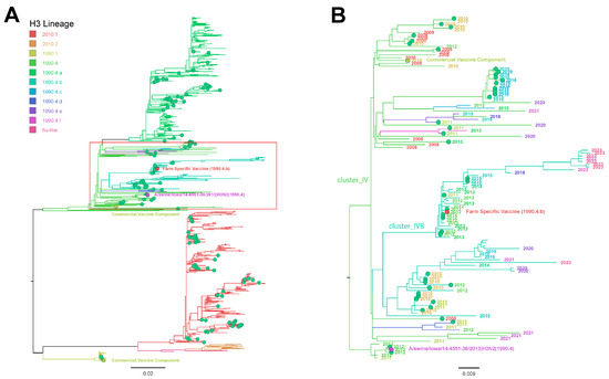 - Diaz, A.; Marthaler, D.; Culhane, M.; Sreevatsan, S.; Alkhamis, M.; Torremorell, M. Complete Genome Sequencing of Influenza A Viruses within Swine Farrow-to-Wean Farms Reveals the Emergence, Persistence, and Subsidence of Diverse Viral Genotypes. J. Virol. 2017, 91, e00745-17. [Google Scholar] [CrossRef]