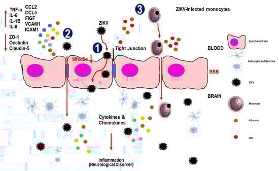 In addition, ZIKV infection can infect and release the apical and basolateral surfaces of BMECs []. Several in vitro experiments show that ZIKV can replicate and cross the BBB without affecting its permeability and integrity. The lower chamber of the trans-well system contained ZIKV RNA, although the integrity of the endothelium was preserved. These studies demonstrate that ZIKV can penetrate or pass through the BBB via transcytosis, paracellular, or basolateral viral release. Positively charged ZIKV particles are attached to negatively charged brain endothelial cell membranes by a charge-based process, leading to transcytosis. The permeability of MECs was not affected by the release of type I and type III IFNs and inflammatory cytokines, but transinfection was facilitated. These results suggest that the extravasation of ZIKV through the MEC monolayer can be effectively stopped by drugs that inhibit ZIKV replication or transcytosis.