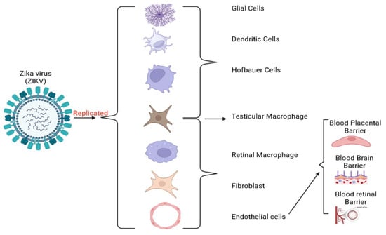 Replication of the ZIKV and its target human cells. ZIKV infects pregnant women by targeting trophoblasts and Hofbauer cells. It can cross the BPB and cause an immunologic response and brain cell death, impairing neurogenesis and leading to microcephaly []. In brain development, ZIKV infects radial glial cells and intermediate progenitor cells constituting the brain and CNS []. ZIKV also overcomes the BBB by infecting the brain endothelial cells and altering the tight junction proteins.