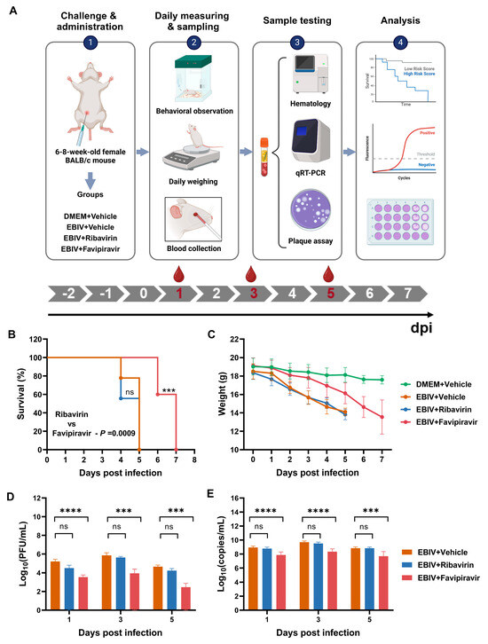 We evaluated whether favipiravir, or ribavirin could protect BALB/c mice from EBIV infection (Figure 1A). The curves of survival and body weight changes in EBIV-infected BALB/c mice treated with vehicle, favipiravir, and ribavirin are shown in Figure 1B,C.