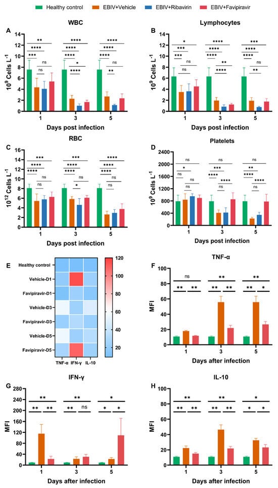 Hematologic and cytokine analyses on 1, 3, and 5 dpi in untreated and treated EBIV-infected mice. The count of (A) total white blood cells (WBCs), (B) lymphocytes, (C) total red blood cells (RBC), and (D) platelets. (E) Heatmap analysis of cytokine. Level of (F) TNF-α, (G) IFN-γ, and (H) IL-10. Healthy control were the mice without infection; mice in infection groups were inoculated intraperitoneally with 10 PFU EBIV and treated intraperitoneally with vehicle, favipiravir, or ribavirin. The treatment (administrated every 12 h) began at 2 days prior to virus infection and continued until death or 25% decline in body weight for the mice. * p < 0.05, ** p < 0.01, *** p < 0.001, **** p < 0.0001, ns: no significant difference.