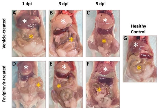 Gross pathology of mice in the healthy, favipiravir-treated, and vehicle-treated groups at 1, 3, and 5 days post infection. Fifteen mice in each group were infected intraperitoneally with 10 PFU EBIV and treated intraperitoneally with favipiravir or vehicle. The treatment (administrated every 12 h) began 2 days prior to EBIV infection and continued until 5 dpi. Five mice in each group were randomly sacrificed at 1, 3, and 5 dpi. Five healthy mice were also sacrificed to serve as healthy controls. (A–C) represent gross pathology of mice in the vehicle-treated group at 1, 3, and 5 dpi of EBIV infection, respectively. (D–F) represent gross pathology of mice in the Favipiravir-treated group at 1, 3, and 5 dpi of EBIV infection, respectively. (G) represents the gross pathology of healthy mice. The white stars indicate the mouse’s liver and the orange stars indicate the mouse’s intestine.