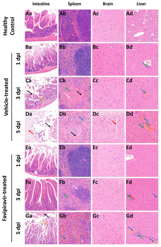 Histopathological changes in tissues from healthy and EBIV-infected BALB/c mice. HE staining revealed pathological lesions in sections of the liver, intestine, brain, and spleen of BALB/c mice treated with vehicle or favipiravir and infected with EBIV. Fifteen mice in each group were infected intraperitoneally with 10 PFU EBIV and treated intraperitoneally with favipiravir or vehicle. The treatment (administrated every 12 h) began 2 days prior to virus infection and continued until 5 dpi. Tissues were harvested on 1, 3, and 5 dpi from mice of the vehicle-and favipiravir-treated groups. Healthy mice were also sacrificed to serve as healthy controls. Tissue damage was identified and is indicated by arrows (magnification, 200×). (Aa–Ad) Intestines, spleen, brain and liver of the healthy mice, respectively. (Ba–Bd) Intestines, spleens, brains, and livers of vehicle-treated group of mice at 1 dpi of EBIV infection, respectively. (Ca–Cd) Intestines, spleens, brains and livers of mice in the vehicle-treated group at 3 dpi of EBIV infection, respectively. (Da–Dd) Intestines, spleens, brains and livers of mice in the vehicle-treated group at 5 dpi of EBIV infection, respectively. (Ea–Ed) Intestines, spleens, brains and livers of mice in the Favipiravir-treated group at 1 dpi of EBIV infection, respectively. (Fa–Fd) Intestines, spleens, brains and livers of Favipiravir-treated group mice at 3 dpi of EBIV infection, respectively. (Ga–Gd) Intestines, spleens, brains and livers of Favipiravir-treated group mice at 5 dpi of EBIV infection, respectively. The lesions indicated by the different arrows are explained in the text.