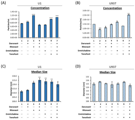Antiretrovirals increase the release of EVs from HIV-1-infected monocytes. U1 (HIV-1-infected monocytes) and U937 (uninfected monocytes) cells were treated twice with darunavir (10 µM), ritonavir (5 µM), darunavir/ritonavir (10 µM/5 µM), emtricitabine (10 µM), tenofovir (10 µM), or a combined regimen (10 µM of emtricitabine, tenofovir, darunavir, and 5 µM of ritonavir) for 5 days in exosome-free media. Supernatants were analyzed using NTA to assess for drug-mediated changes in the released EV numbers in the treated U1 (A) and U937 (B) cells. An additional analysis was used to investigate the change in EV median diameter from U1 (C) and U937 (D) cells. Statistical significance was assessed using a two-tailed Student’s t-test comparing the treated samples (lanes 2–7) to an untreated control (lane 1). */+ p < 0.05, **/++ p < 0.01, +++ p < 0.001, in which */+ represents a significant decrease/increase, respectively.
