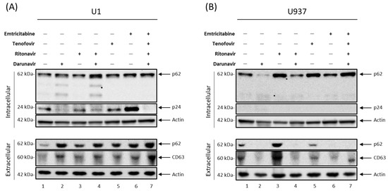 Antiretroviral drugs alter autophagy. U1 (HIV-1-infected monocytes; (A)) and U937 (uninfected monocytes; (B)) cells were treated twice with darunavir (10 µM), ritonavir (5 µM), darunavir/ritonavir (10 µM/5 µM), emtricitabine (10 µM), tenofovir (10 µM), or a combined regimen (10 µM of emtricitabine, tenofovir, darunavir, and 5 µM of ritonavir) for 5 days in exosome-free media. Following incubation, the cells and cell culture supernatant were harvested, and EVs were enriched from the supernatant using NT80/82. The intracellular material was analyzed via Western blot for the presence of the autophagy marker p62, HIV-1 viral proteins p24 (Gag protein), and Actin as a control. The extracellular (EV) material was analyzed via Western blot for the presence of p62, the EV marker CD63, and Actin as a control.