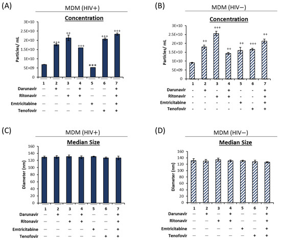 Antiretrovirals increase the release of EVs from HIV-1-infected monocyte-derived macrophages. U1 (HIV-1-infected monocytes) and U937 (uninfected monocytes) cells were differentiated into monocyte-derived macrophages (MDMs) using PMA (100 nM) over 7 days. Following differentiation, MDMs were treated twice with darunavir (10 µM), ritonavir (5 µM), darunavir/ritonavir (10 µM/5 µM), emtricitabine (10 µM), tenofovir (10 µM), or a combined regimen for 5 days in exosome-free media. The supernatants were analyzed using NTA to assess drug-mediated changes in the released EV numbers in the treated HIV+ MDMs (A) and HIV− MDMs (B). An additional analysis investigated the changes in the EV median diameter from HIV+ MDMs (C) and HIV− MDMs (D). Statistical significance was assessed using a two-tailed Student’s t-test comparing the treated samples (lanes 2–7) to an untreated control (lane 1). ++ p < 0.01, ***/+++ p < 0.001, in which */+ represents significant decreases/increases, respectively.
