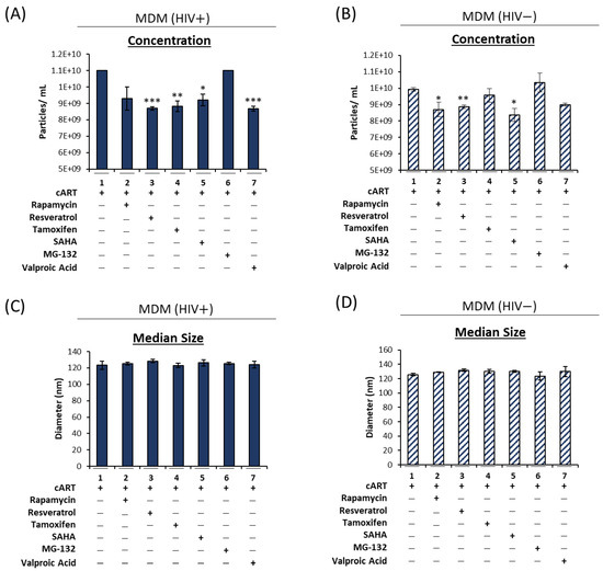 Autophagy-inducing compounds alleviate cART-mediated increases in EV release. U1 HIV-1-infected monocytes and U937 uninfected monocytes were differentiated into macrophages using PMA (100 nM). Post-differentiation MDMs were treated twice with cART (10 µM of emtricitabine, tenofovir, darunavir, and 5 µM of ritonavir) as well as autophagy-inducing compounds: rapamycin (100 nM), resveratrol (1 µM), tamoxifen (2.5 µM), SAHA (1 µM), MG-132 (50 nM), and valproic acid (60 µM) for 5 days. Following incubation, the HIV+ MDM (A) and HIV− MDM (B) supernatants were analyzed using NTA to assess changes in the number of EVs released. An additional analysis investigated changes in the EV median diameter from HIV+ MDM (C) and HIV− MDM (D). Statistical significance was assessed using a two-tailed Student’s t-test comparing the treated samples (lanes 2–7) to an untreated control (lane 1). * p < 0.05, ** p < 0.01, *** p < 0.001, in which * represents significant decreases.