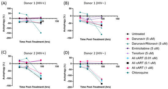 Treatment of primary macrophages with cART inhibits autophagosome fusion with the lysosome. Primary macrophages were infected with HIV-SF162 at an MOI of 1 and treated with antiretrovirals every 48 h. Autophagy was assessed using an RFP-GFP-LC3B tandem autophagy sensor. The experiments were performed in two independent donors, Donor 1 (A,B) and Donor 2 (C,D) +/− HIV-1 infection. Autophagy was measured at 24, 48, and 96 h post-treatment, and data points represent an average of 12 technical replicates.